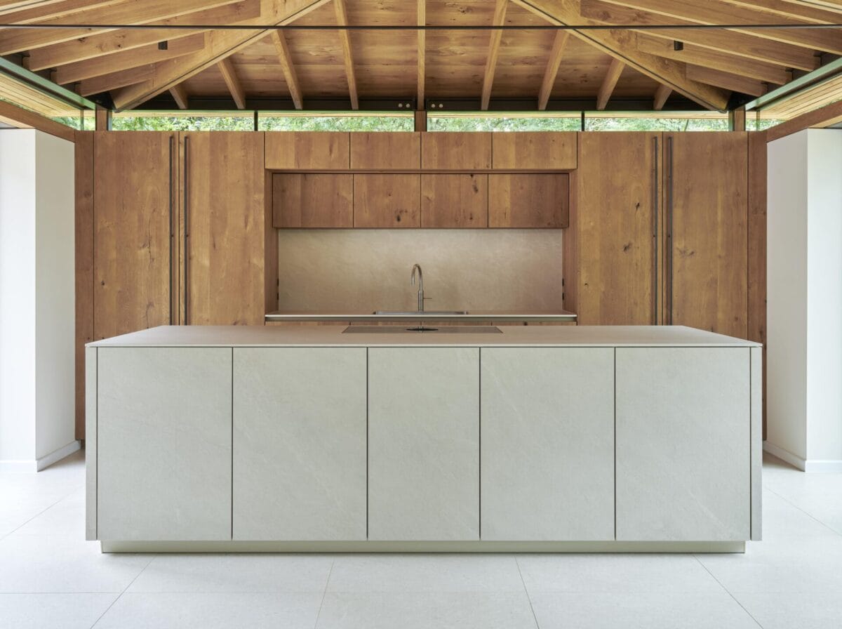 Materiality was key in delivering the desired architectural blend. Only two finishes were used: a warm light oak that mirrors the timber ceiling, anchoring the kitchen to the building fabric; and a pale ceramic that echoes the flooring, creating the illusion that the island rises from the ground. The two-tone island features oak to the front-facing, functional side—offering a tactile warmth where it matters most.